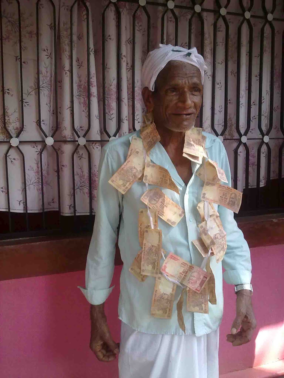 | കുറുവാളില് പ്രദേശവാസികളുടെ വക നോട്ട് മാല രായീന് കാക്ക അണിയിക്കുന്നു. |